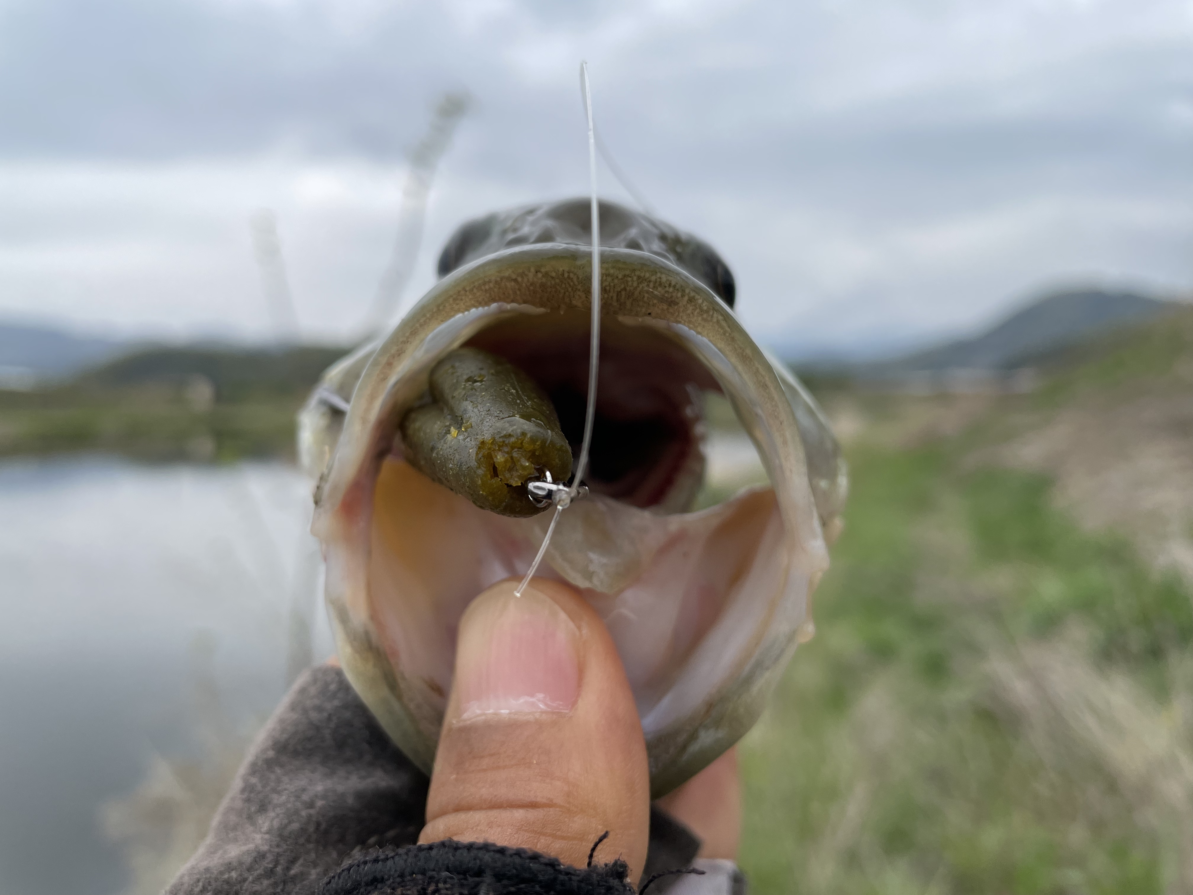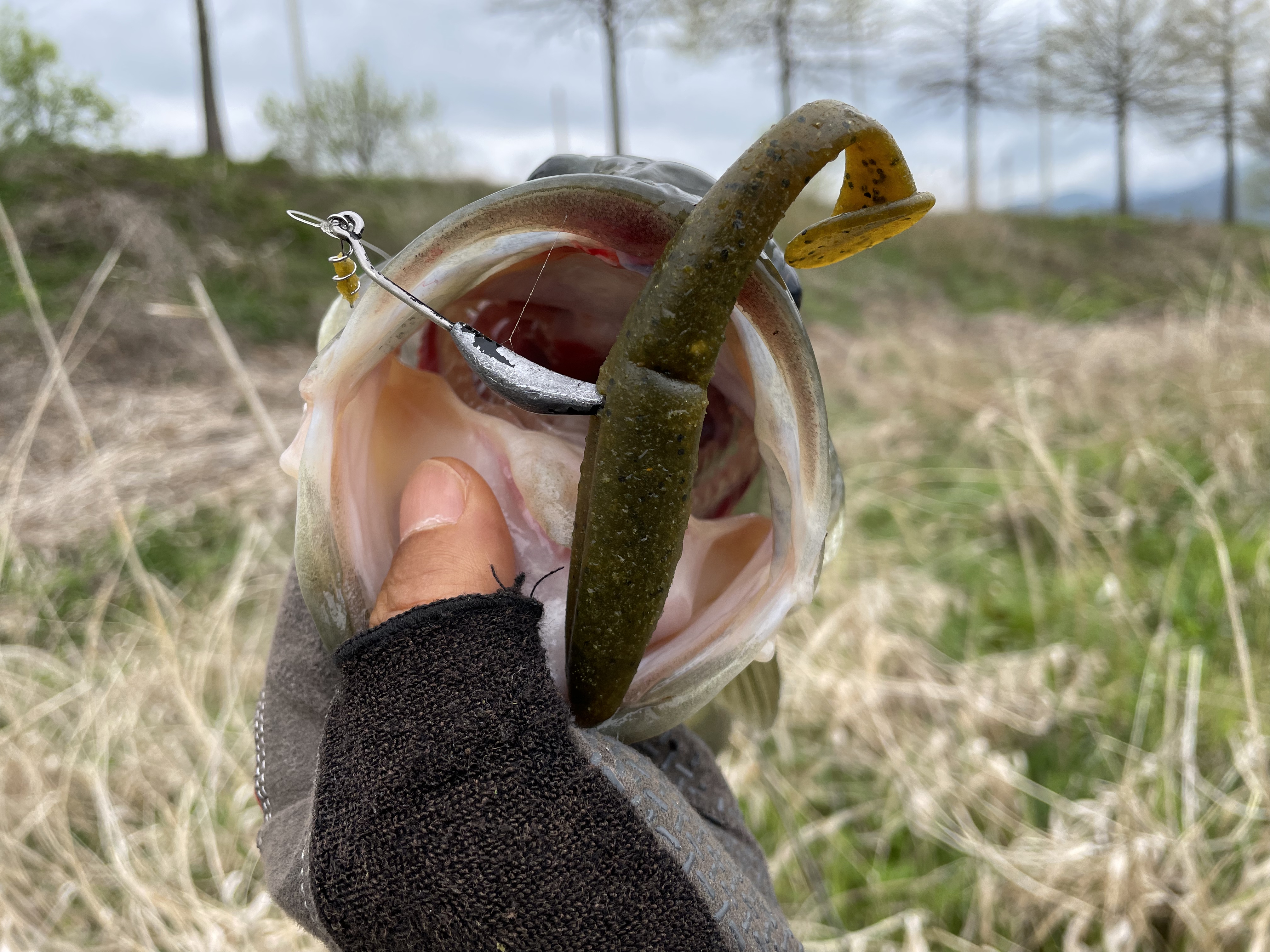 스피너베이트로 교체한 뒤 바닥을 긁어 짜치배스를 한 마리 더 만나고,,,
